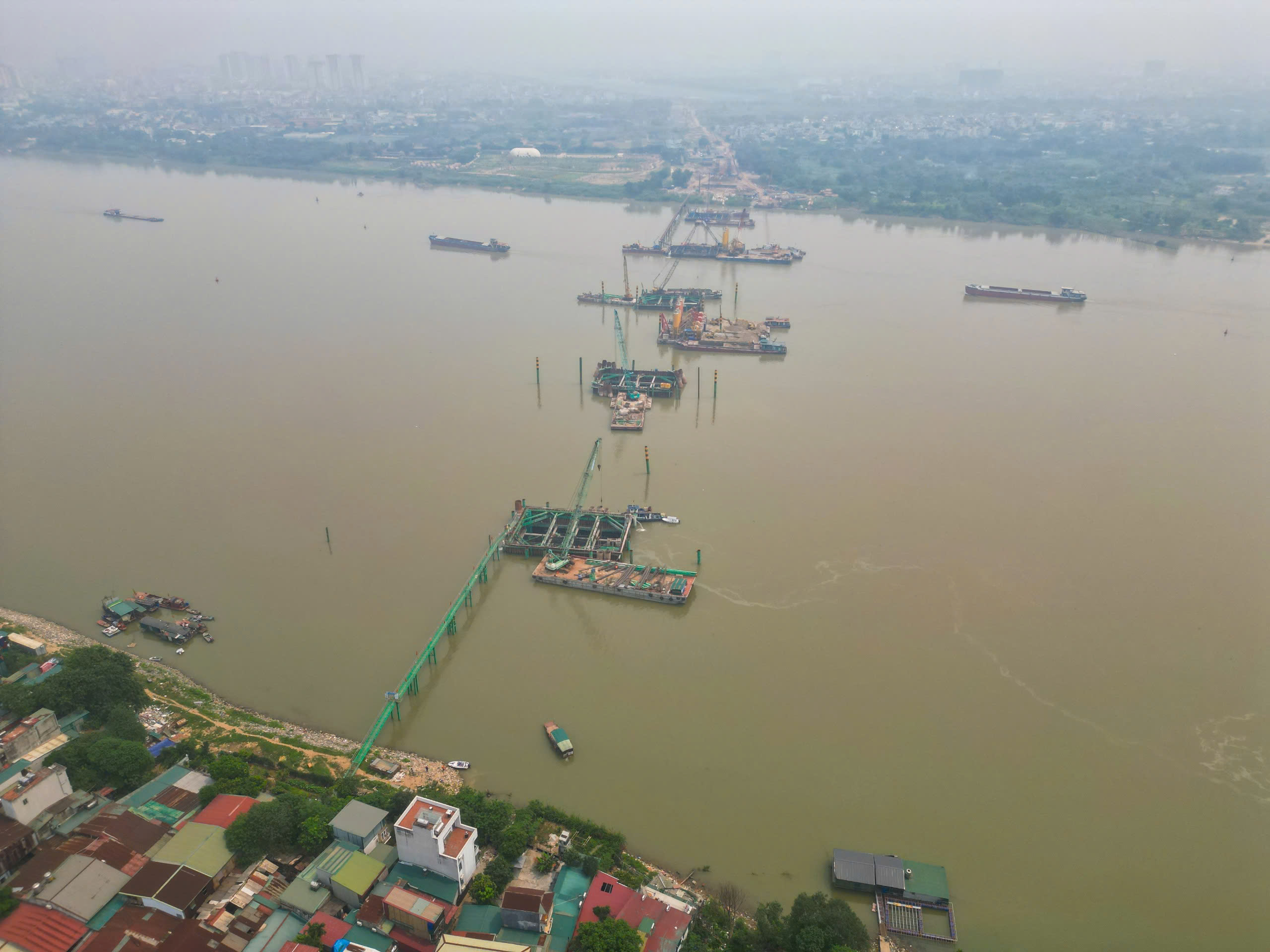 Theo ghi nhận của PV Lao Động ngày 7.4, công tác thi công dự án đang được nhà thầu triển khai ở giữa lòng sông Hồng và trên bờ phía Long Biên.