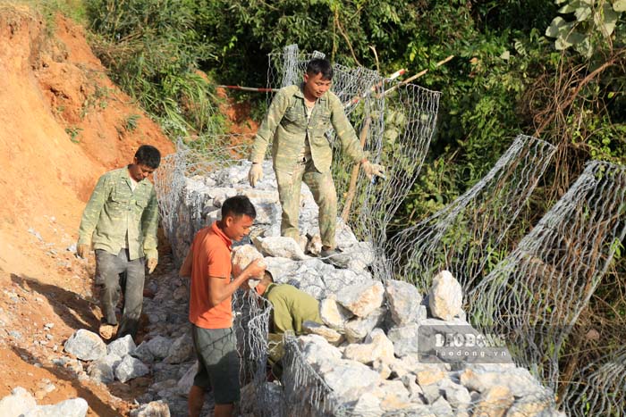 Tại Km242 (khu vực bản Trại Bò, xã Na Son), hơn chục công nhân đang kè rọ đá để gia cố taluy âm, nỗ lực giữ lại nền đường sau đợt lũ quét.