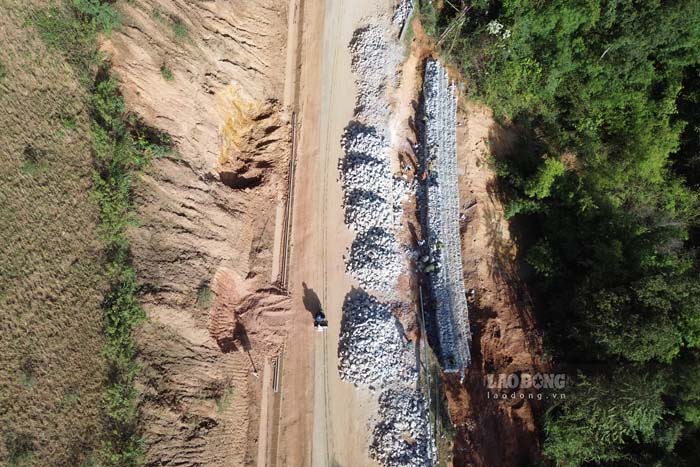 Bên cạnh đó, nhiều đoạn tuyến đã bị sạt lở sâu vào nền đường. Đơn vị thi công phải huy động một khối lượng đất, đá hộc rất lớn để san lấp, tái tạo lại nền đường.