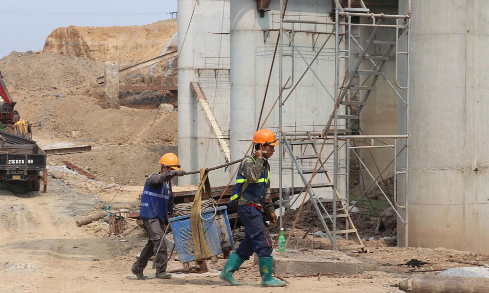 Giữa nắng nóng trên công trường thi công cầu Ngòi Bục, không khí thi công vẫn diễn ra khẩn trương. Ảnh: Đinh Đại