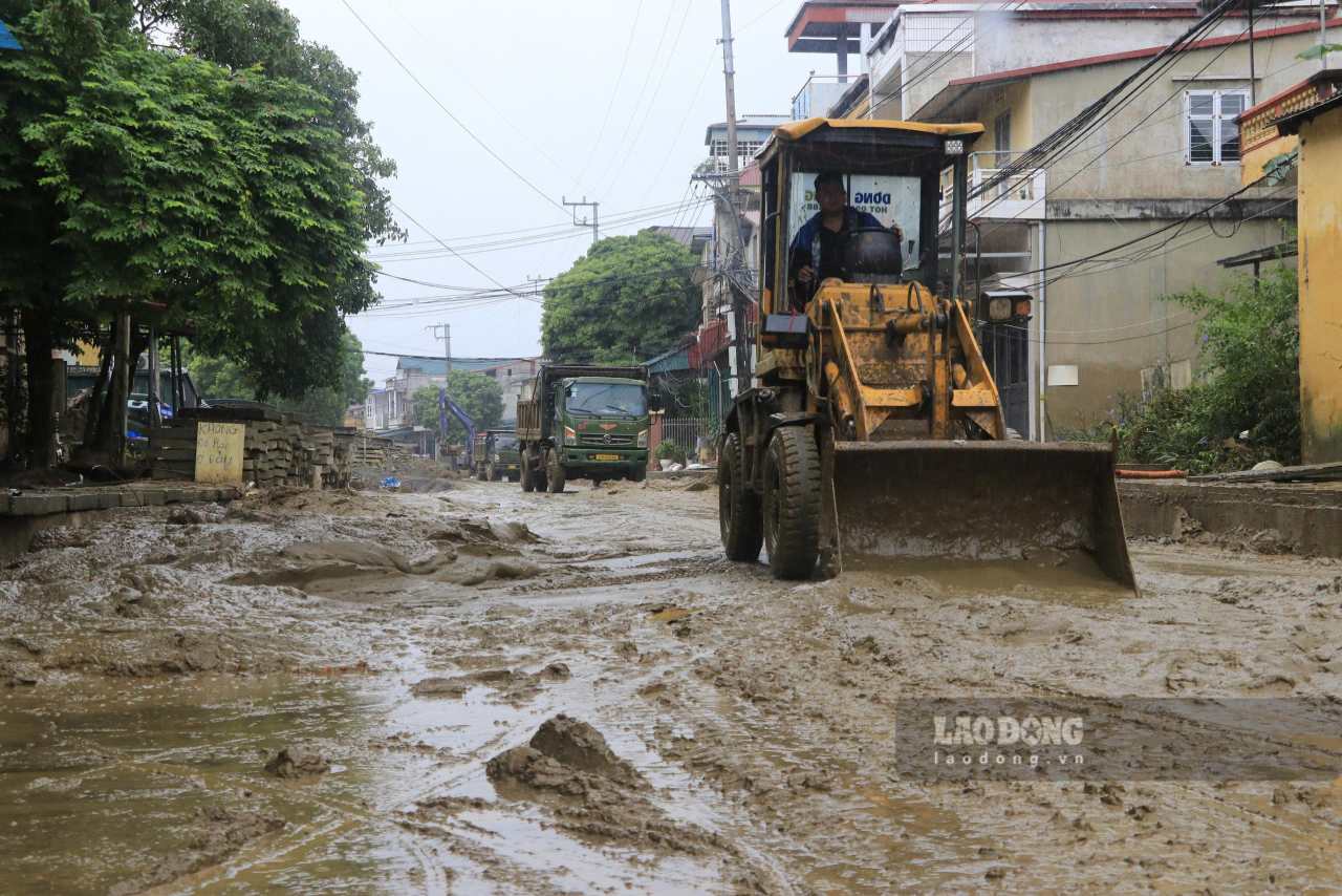 Ông Nguyễn Tiến Sĩ, Phó Giám đốc Công ty Cổ phần Xây dựng và Thương mại Tiến Đạt cho biết - sau khi nước rút, công ty huy động 12 ôtô và máy xúc cùng nhân lực hót dọn bùn đất, đảm bảo giao thông đi lại và đời sống sinh hoạt cho người dân.