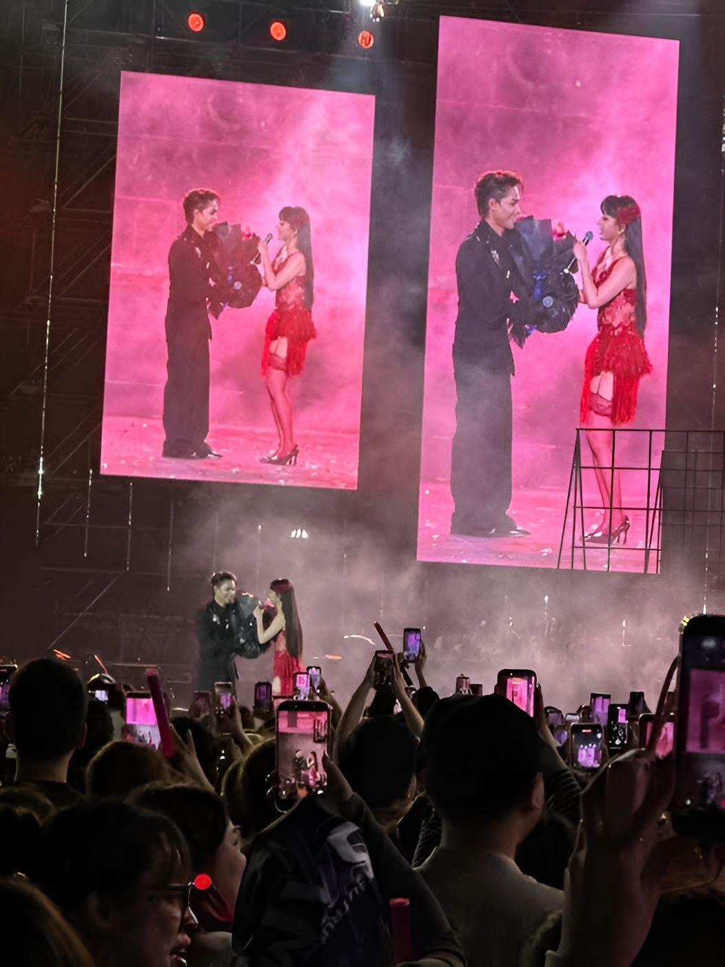 Tăng Duy Tân tặng hoa, tung hứng với Bích Phương tại sân khấu. Ảnh: Cắt từ video