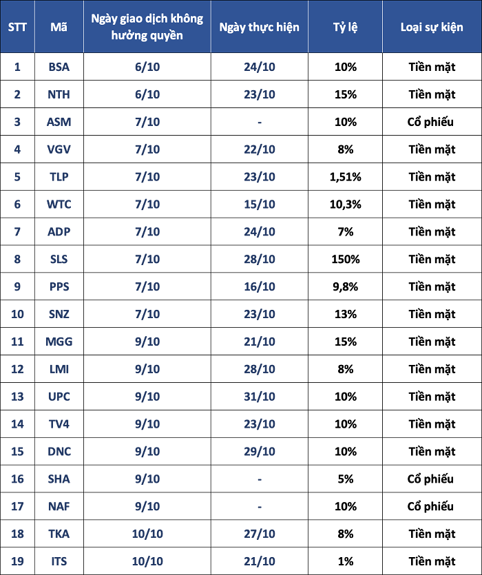 Trong tuần từ 6/10 đến 10/10, thị trường chứng khoán có 19 doanh nghiệp chốt ngày giao dịch không hưởng quyền để nhận cổ tức tiền mặt, cổ phiếu.