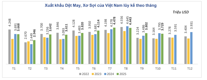 Tính chung, tổng kim ngạch xuất khẩu hàng dệt may 10 tháng 2025 ước đạt 38,33 tỷ USD, tăng 6,3% so cùng kỳ 2024.