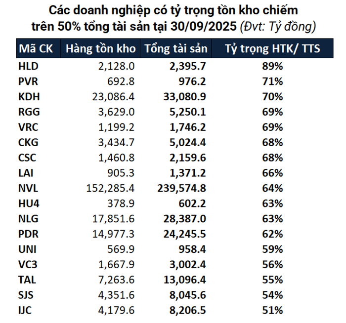 Có 17 doanh nghiệp có tồn kho chiếm trên 50% tổng tài sản, trong đó dẫn đầu là Công ty Cổ phần Đầu tư và Phát triển Bất động sản HUDLAND (HNX: HLD) với tỷ lệ 89%, tương đương hơn 2.100 tỷ đồng. Công ty Cổ phần Tập đoàn Đầu tư Regal Group (UPCoM: RGG) có 3.600 tỷ đồng tồn kho, chiếm 69% tổng nguồn vốn. Công ty Cổ phần Bất động sản Taseco (HOSE: TAL) và Công ty Cổ phần Sông Đà 1.01 - SJ Group (HOSE: SJS) cũng thuộc nhóm này, với tỷ lệ lần lượt 55% và 54%.