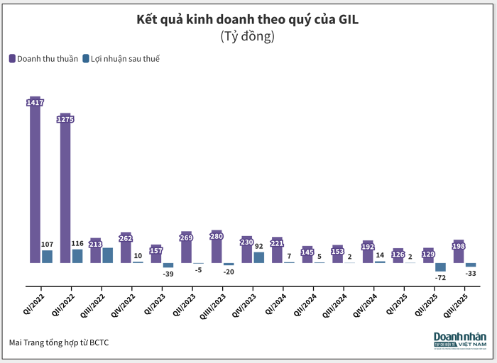 Lũy kế 9 tháng đầu năm 2025, GIL ghi nhận doanh thu 453 tỷ đồng, giảm 13% so với cùng kỳ và ở mức thấp nhất trong vòng 15 năm.