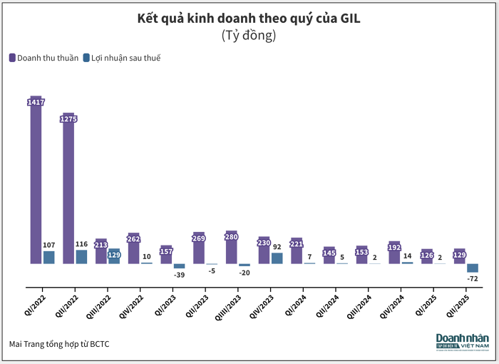 Từ quý IV/2022 đến nay, doanh thu Gilimex mỗi quý chỉ xoay quanh 100-300 tỷ đồng, thấp hơn hẳn giai đoạn trước từng vượt nghìn tỷ đồng. Lợi nhuận ròng duy trì ở mức thấp, nhiều quý liên tiếp thua lỗ.