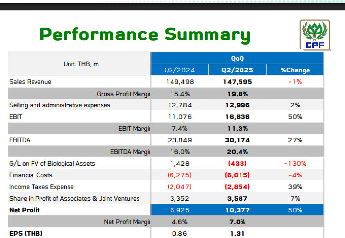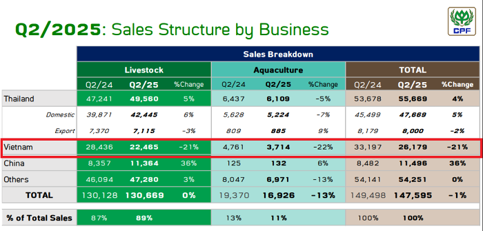 Tuy nhiên, cũng có “ông lớn” đi lùi kết quả kinh doanh trong quý này, là C.P. Việt Nam. Trong quý II/2025, "ông trùm" chăn nuôi Thái Lan ghi nhận tổng doanh thu gần 147,6 tỷ Baht, tương đương gần 119.500 tỷ đồng đồng (theo tỷ giá ngày 19/8), giảm 1% so với cùng kỳ. Tuy nhiên, lãi ròng vẫn tăng mạnh 50% lên 10,4 tỷ Baht, chủ yếu nhờ biên lãi cải thiện đáng kể nhờ đà tăng của giá thịt heo và giá gia cầm.