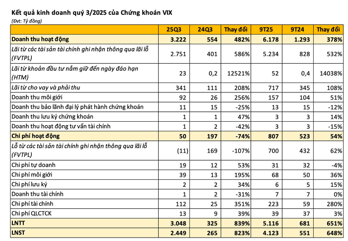 Tính chung 9 tháng đầu năm 2025, VIX đạt doanh thu hoạt động 6.178 tỷ đồng, tăng 378% so với cùng kỳ; lợi nhuận trước thuế đạt 5.116 tỷ đồng và lợi nhuận sau thuế 4.123 tỷ đồng, tăng hơn 6,5 lần. Với kết quả này, công ty đã vượt kế hoạch lợi nhuận năm, khi hoàn thành 102,3% chỉ tiêu lợi nhuận trước thuế và 103,1% chỉ tiêu lợi nhuận sau thuế.