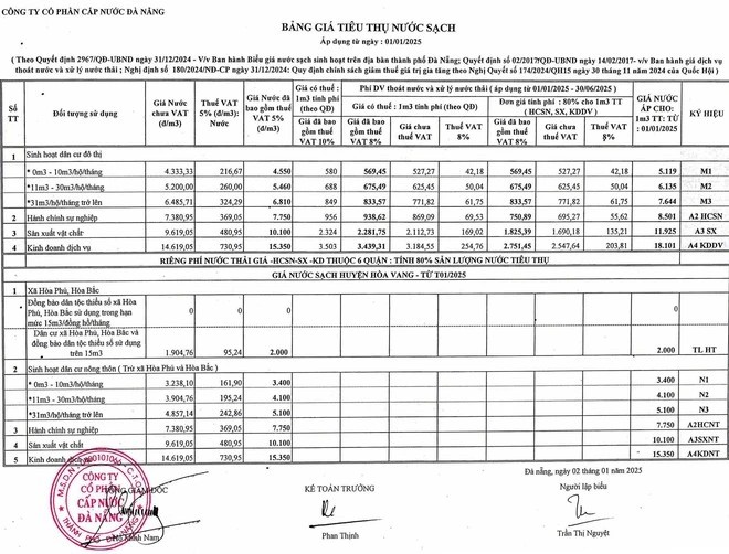 Bảng so sánh giá nước sạch của Quảng Nam (ảnh dưới) hiện cao gần gấp đôi so với TP Đà Nẵng (ảnh trên). Ảnh: Trường An