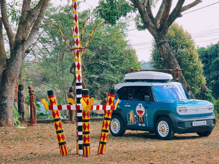 Trang trí VF 3 phong cách Doraemon, chủ xe 9x chở văn hóa Gia Rai đi khắp Việt Nam