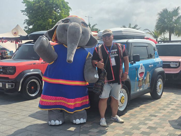 Tôi lấy cảm hứng từ hình ảnh chú mèo máy Doraemon để trang trí cho xe. Tuy nhiên, điều đặc biệt nằm ở bộ trang phục mặc trên người nhân vật và những chi tiết bên cạnh. Theo đó, chú mèo Doraemon này mặc trang phục truyền thống của dân tộc Gia Rai (còn gọi là Jrai). Các chi tiết bên cạnh chúng ta có thể thấy nhà rông, một hình tượng đặc trưng của đồng bào các dân tộc Tây Nguyên.