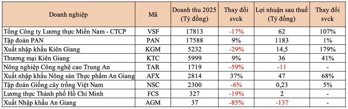 Theo thống kê của phóng viên, doanh thu của 9 doanh nghiệp kinh doanh gạo niêm yết trên sàn năm 2025 đạt gần 53.830 tỷ đồng, giảm 10% so với năm 2024. Tuy nhiên, lãi ròng lại đảo chiều sang trạng thái dương, khi tăng tới 43%. Bên cạnh việc các “ông lớn” như PAN, VSF, NSC tiếp tục duy trì lợi nhuận ổn định, Angimex và Trung An thu hẹp đáng kể khoản lỗ cũng giúp bức tranh toàn ngành thêm phần tích cực.