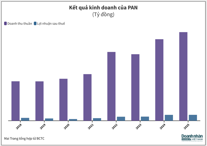 Cụ thể, Tập đoàn PAN (mã: PAN) tăng nhẹ lợi nhuận lên 1.183 tỷ đồng, trong khi doanh thu chạm mốc gần 17.590 tỷ, cao nhất trong lịch sử hoạt động. Tuy nhiên tập đoàn này còn có sự đóng góp của nhiều mảng kinh doanh khác như thuỷ sản, thực phẩm đóng gói.