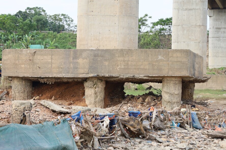 Sau khi nước sông rút, dễ dàng nhìn thấy móng trụ cầu. Với trụ T3, phần đất nền sau khi bị xói mòn đã thấp hơn chân trụ cầu khoảng hơn 1m, đặc biệt có móng cọc nhồi mất đi lớp bêtông bảo vệ, trơ cốt thép đang hoen gỉ.