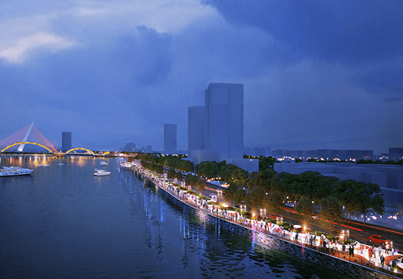 Phối cảnh Phố đi bộ Bạch Đằng chạy dọc bờ Tây sông Hàn.