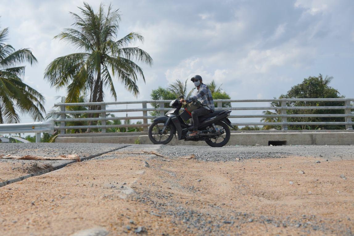 Mặt cầu chưa được thi công xong và vật liệu ngổn ngang trên một cây cầu ở Đường tỉnh 918. Ảnh: Tạ Quang