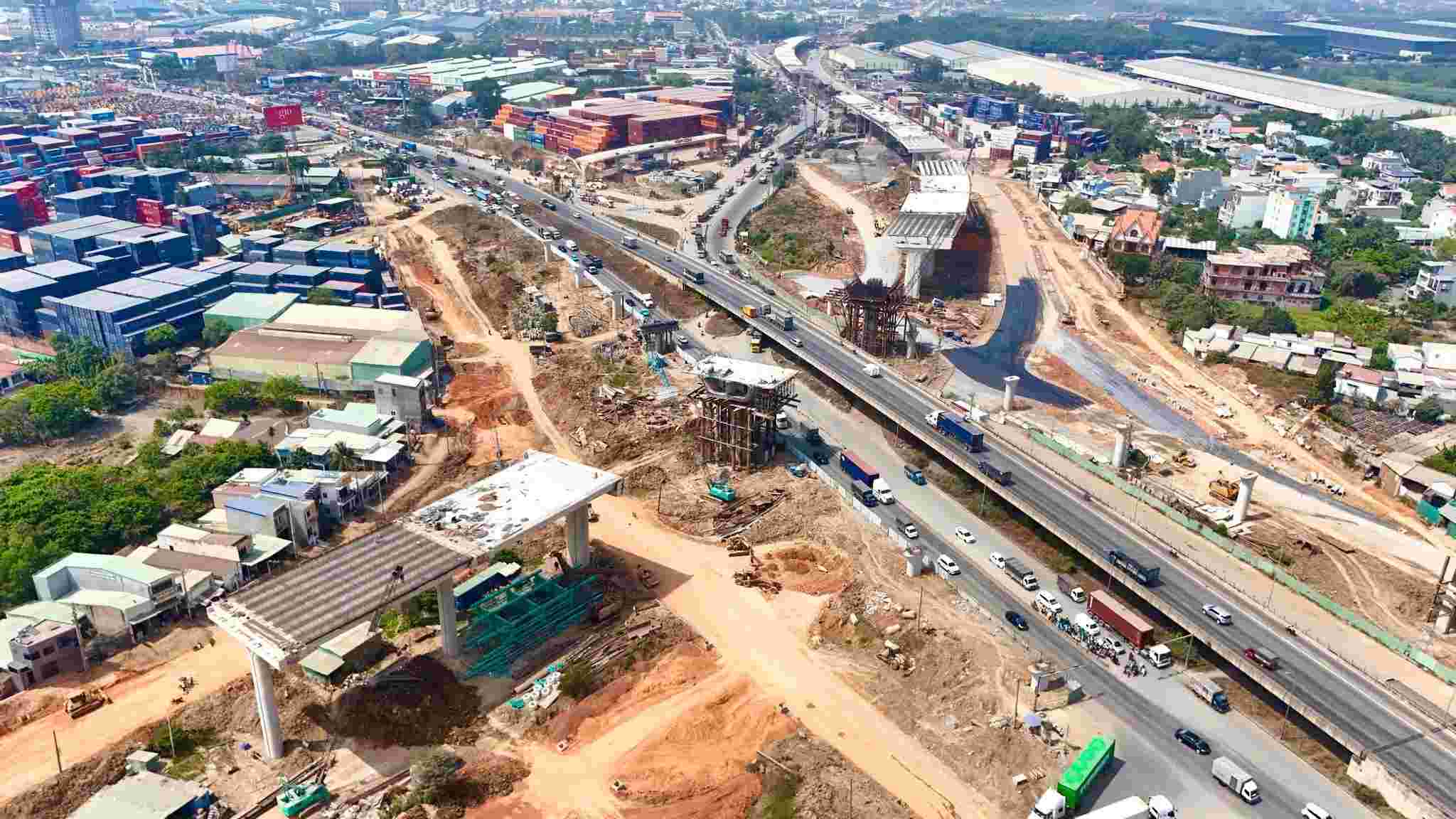 Hiện các nhà thầu đang thi công xuyên ngày đêm. Tại khu vực Quốc lộ 1, nhiều trụ bê tông cho các nhánh cầu vượt đã hoàn thành, các trụ còn lại đang được gấp rút triển khai.