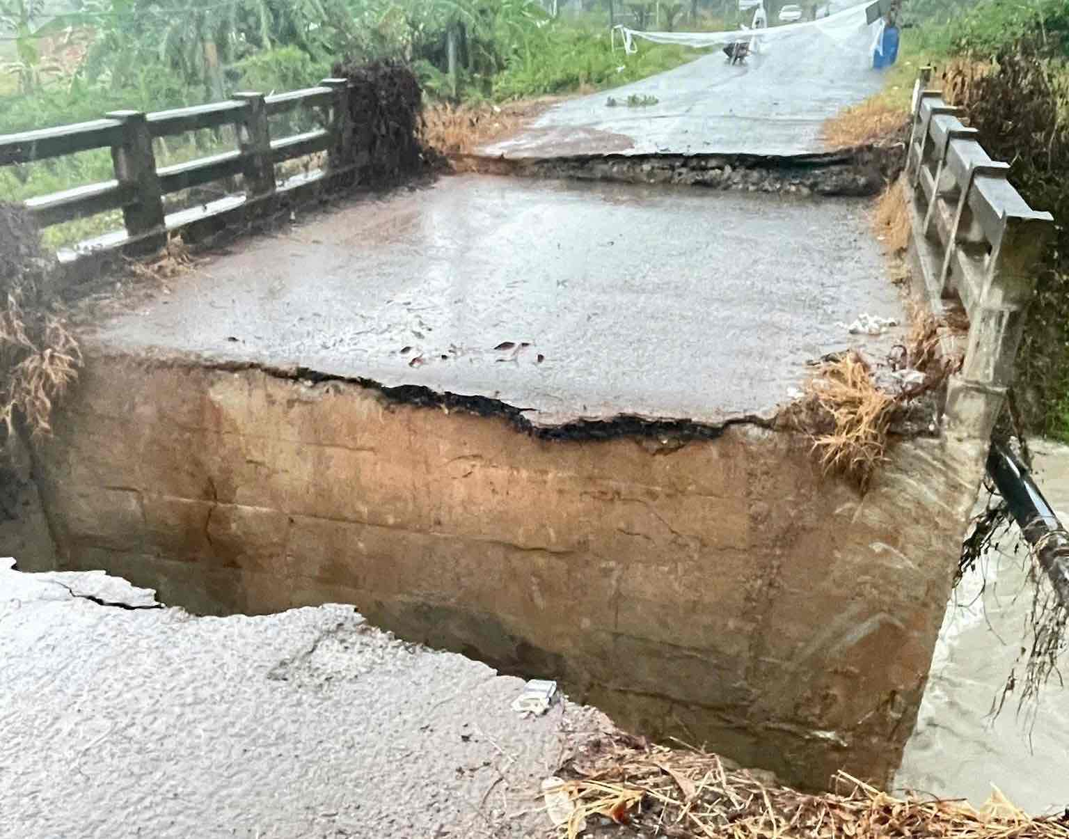 Tại hiện trường, một phần cầu bị hư hỏng nặng, gần đó mặt đường bị sụt lún nghiêm trọng, nhiều vết nứt lớn.
