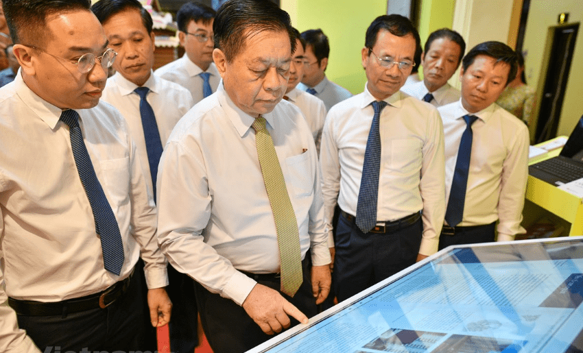 Trưởng Ban Tuyên giáo Trung ương Nguyễn Trọng Nghĩa (phải) tham dự triển lãm bên lề hội thảo. (Ảnh: PV/Vietnam+) |