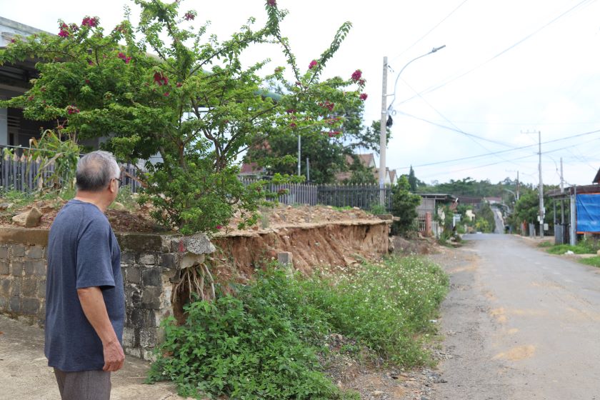 Bà Mai Xuân Cường (75 tuổi) cho biết, gia đình đã hiến đất để làm đường, nhưng đoạn trước nhà bà vẫn bị bỏ bê, gây nguy hiểm do xói mòn.
