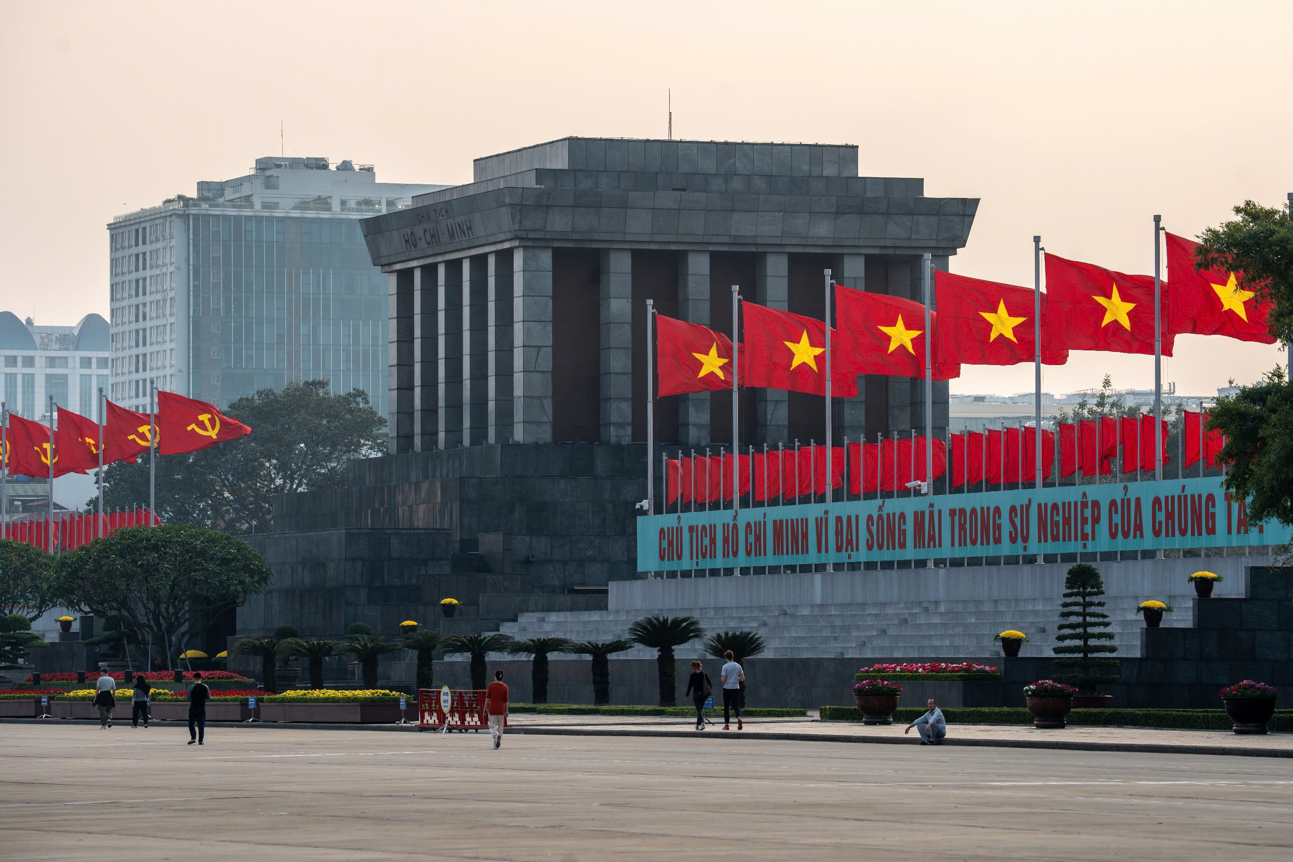 Dọc các trục đường dẫn vào quảng trường và khu vực Lăng Chủ tịch Hồ Chí Minh, cờ Đảng, cờ Tổ quốc được treo trang trọng, thẳng hàng, nổi bật trên nền không gian rộng lớn.