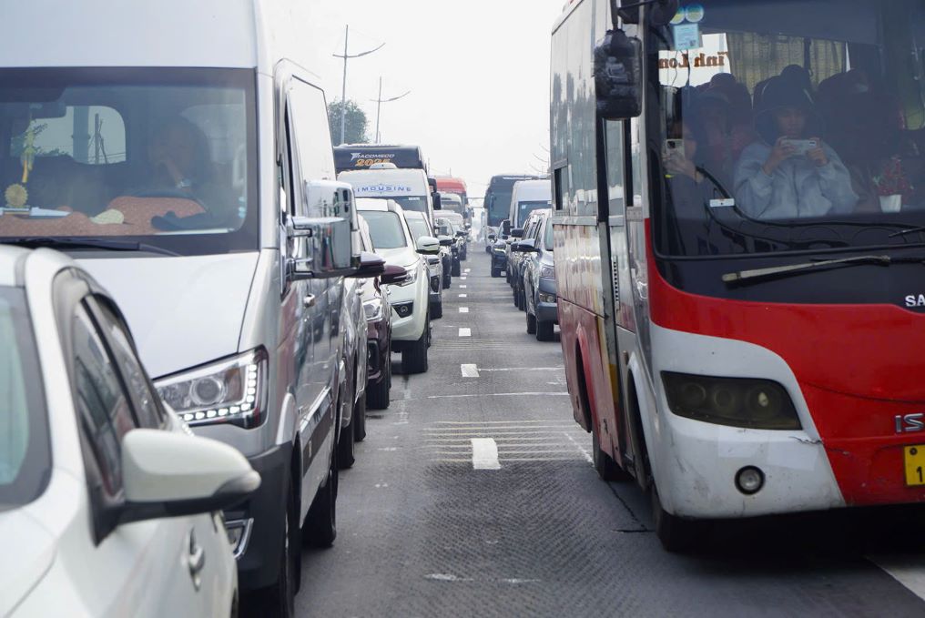 Dòng phương tiện nối đuôi kéo dài nhiều km, di chuyển chậm chạp, có thời điểm gần như đứng yên. Ôtô cá nhân, xe khách và xe tải chen kín mặt đường.