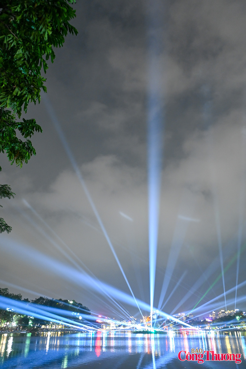 Hàng ngàn người dân Thủ đô cũng như du khách đã đứng quanh Hồ Gươm để thưởng thức màn trình diễn ánh sáng đầy nghệ thuật này.
