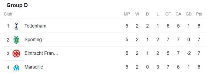 Lúc này, Tottenham vẫn đứng đầu bảng với 8 điểm, Sporting xếp thứ 2 với 7 điểm, Frankfurt cũng có 7 điểm còn Marseille đứng cuối song sở hữu 6 điểm. Ở lượt cuối, Tottenham sẽ làm khách trước Marseille, trong khi Sporting tiếp Frankfurt.