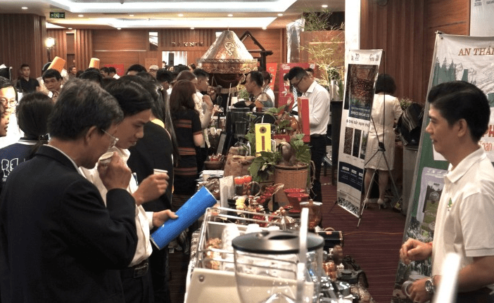 Khách mời trực tiếp thưởng thức cà phê, trao đổi thông tin, kết nối giao thương tại buổi họp báo. |