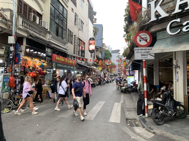 Khách quốc tế di chuyển trên phố Đinh Liệt. Ảnh: Ý Yên