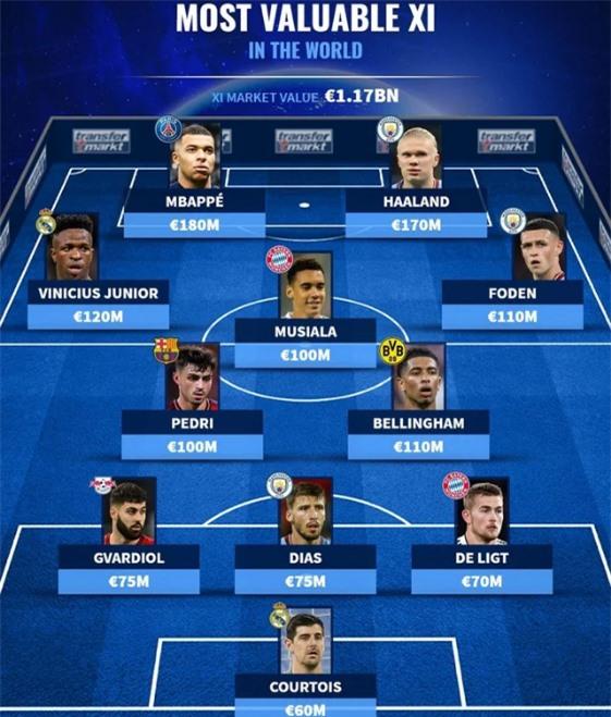 Theo Transfermarkt, đội hình 11 cầu thủ đắt nhất thế giới ở thời điểm hiện tại có giá 1,17 tỷ euro.