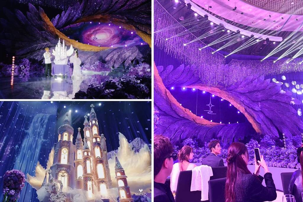 Đến tiệc cưới chính buổi tối, không gian lễ đường trang hoàng lộng lẫy, xa hoa theo tông màu tím chủ đạo. Thông qua những hình ảnh, video khách mời chia sẻ, cư dân mạng ví von không gian tiệc cưới của Hoàng Tử Thao và Từ Nghệ Dương như “lạc vào truyện cổ tích”.