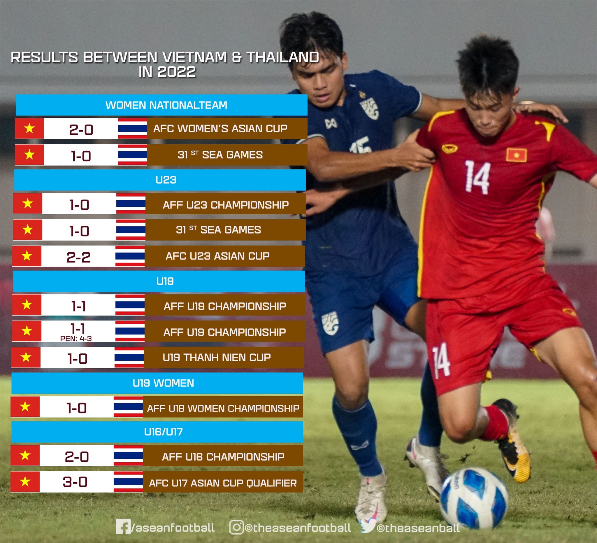Cụ thể hơn, các đội tuyển Việt Nam thắng 9 trận và hòa 2 trận trước Thái Lan trong năm 2022. Theo đó, đội tuyển nữ Việt Nam thắng 2 trận trước Thái Lan tại VCK châu Á (thắng 2-0) và chung kết SEA Games 2021 (thắng 1-0). Đây đều là những trận đấu quan trọng giúp ĐT nữ Việt Nam lần đầu tiên giành vé dự World Cup cũng như lập kỷ lục về số huy chương vàng SEA Games (7 HCV). Tiếp đến, đội U18 nữ Việt Nam cũng thắng 1-0 ĐT U18 Thái Lan tại giải U18 nữ Đông Nam Á.