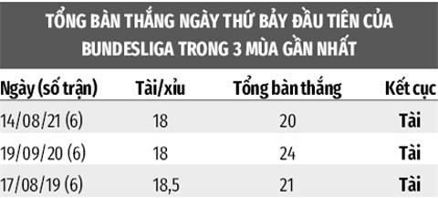 3 năm liên tiếp gần nhất, các ngày thứ Bảy đầu tiên của mùa giải ở Bundesliga đều nổ tài loạt trận. Đây là giải đấu thiên về cống hiến nên các đội nhìn chung đều chơi cởi mở ở vòng ra quân để tri ân khán giả yêu thích tấn công. Dự kiến nhà cái sẽ ra tỷ lệ tổng bàn thắng loạt 6 trận Bundesliga hôm nay từ 17 3/4 đến 18 1/2, nên chọn tài. Tuy nhiên giả sử 5 trận đầu có không quá 13 bàn thì càng tin vào cửa tài trận cuối (Dortmund - Leverkusen).