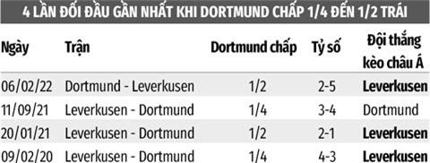 Trong 12 trận chính thức vừa qua trên sân nhà của Dortmund, 9 trận xuất hiện tối thiểu 4 bàn, tức chắc chắn nổ tài. 9 lần gần nhất Dortmund đối đầu Leverkusen, NHM được thưởng thức cả thảy 47 lần lưới rung, trung bình 5,22 bàn/trận, 8 trận trong số này nổ tài (4 bàn trở lên).