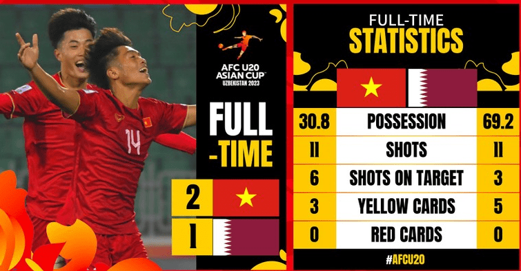 Giành thắng lợi với tỷ số 2-1 trước Qatar, U20 Việt Nam tạm dẫn đầu bảng đấu với 6 điểm sau 2 trận thắng. Kết quả này cũng mở rộng cánh cửa đi tiếp của thầy trò HLV Hoàng Anh Tuấn tại Vòng chung kết U20 châu Á 2023.