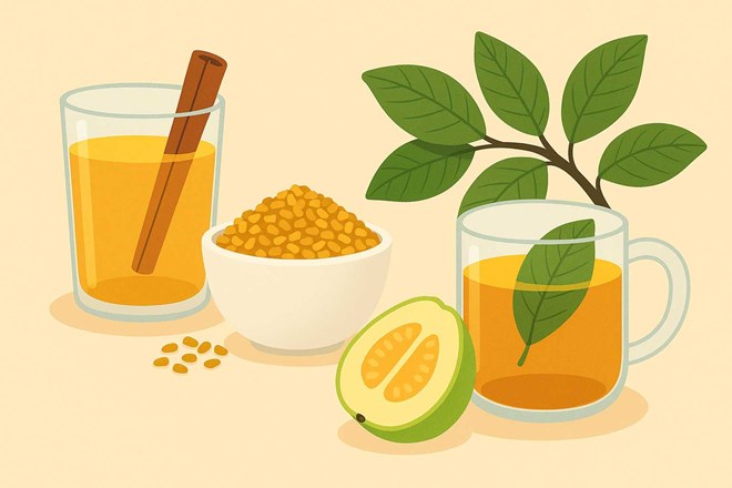 Một trong những bài thuốc được sử dụng phổ biến là lá ổi nấu nước uống. Lá ổi chứa các hợp chất flavonoid như quercetin giúp ức chế men chuyển hóa carbohydrate, từ đó làm chậm quá trình hấp thụ đường vào máu. Có thể lấy 10 - 15 lá ổi non, rửa sạch, nấu với 1 lít nước trong 10 phút, chia làm 2 lần uống trong ngày, sau bữa ăn chính.