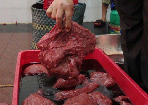 Đối với thịt bò ngâm hóa chất thì miếng thịt thường bị nhão, màu sắc không đều, tự nhiên. Khi ấn tay vào miếng thịt sẽ xuất hiện vân tay in hằn trên miếng thịt. Khi thái, thịt bò không dính dao và nhìn kỹ còn thấy có nước chảy ra.