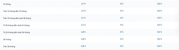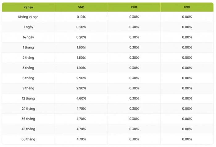 Cụ thể, tại kì hạn 1 và 2 tháng, BIDV niêm yết lãi suất ở mức 1,7%/năm. Tại các kỳ hạn 3 - 5 tháng, BIDV niêm yết lãi suất ở mức 2%/năm. Lãi suất tiết kiệm tại BIDV các kỳ hạn từ 6 - 9 tháng ở mức 3%/năm. Khách hàng gửi tiền từ 12 - 36 tháng nhận lãi suất cao nhất ở mức 4,7%/năm. Khách hàng gửi tiền không kỳ hạn sẽ nhận mức lãi suất ở mức 0,1%/năm.