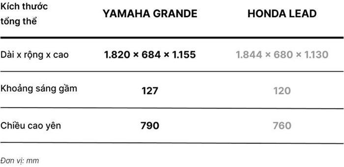 Thực tế, Honda Lead có khối lượng 113 kg, nặng hơn so với mức 100 kg của Yamaha Grande, điều này giúp mẫu xe của Yamaha thân thiện hơn với người dùng nữ, dễ cầm lái cũng như dắt xe ra vào bãi. Bù lại, chiều cao yên của Honda Lead thấp hơn, ở mức 760 mm, so với mức 790 mm trên Yamaha Grande.