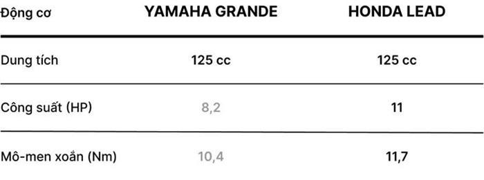 Yamaha Grande 2022 vẫn được trang bị động cơ Blue Core 125 cc, sản sinh công suất 8,2 mã lực tại 6.500 vòng/phút và mô-men xoắn cực đại 10,4 Nm tại 5.000 vòng/phút, mức hiệu suất này thấp hơn Honda Lead.