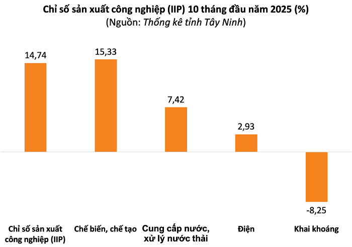 Luỹ kế 10 tháng đầu năm, IIP Tây Ninh tăng 14,74% so với cùng kỳ. Trong đó, công nghiệp chế biến, chế tạo tăng 15,33%; sản xuất và phân phối điện tăng 2,93%; cung cấp nước, quản lý và xử lý rác thải, nước thải tăng 7,42%; khai khoáng giảm 8,25%.