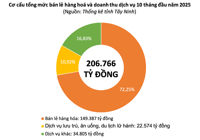Tính chung 10 tháng năm nay, tổng mức bán lẻ hàng hoá và doanh thu dịch vụ tiêu dùng của Tây Ninh ước đạt 206.766 tỷ đồng, tăng 15,65% so với cùng kỳ. Trong đó, bán lẻ hàng hóa ước đạt 149.387 tỷ đồng, tăng 16,03%; dịch vụ lưu trú, ăn uống, du lịch lữ hành ước đạt 22.574 tỷ đồng, tăng 14,56%; dịch vụ khác ước đạt 34.805 tỷ đồng, tăng 14,73%.