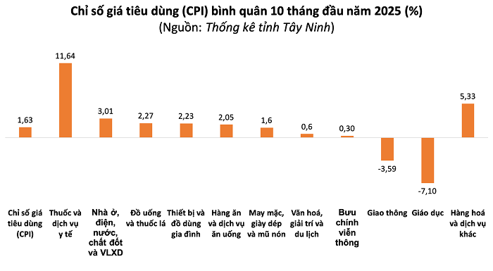 CPI bình quân 10 tháng đầu năm. (Nguồn: AM tổng hợp từ Thống kê tỉnh Tây Ninh).