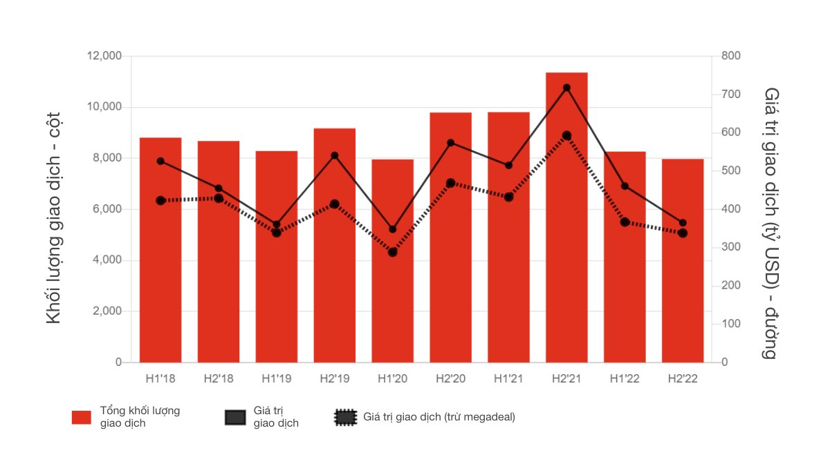 Trong khi năm 2021 ghi nhận số giao dịch ở mức cao kỷ lục (65.000 giao dịch), thị trường M&A toàn cầu đối mặt nhiều thách thức trong năm 2022 với khối lượng giao dịch giảm 17% và giá trị thương vụ giảm 37%, tuy nhiên vẫn duy trì cao hơn năm 2020 và mức trước đại dịch.