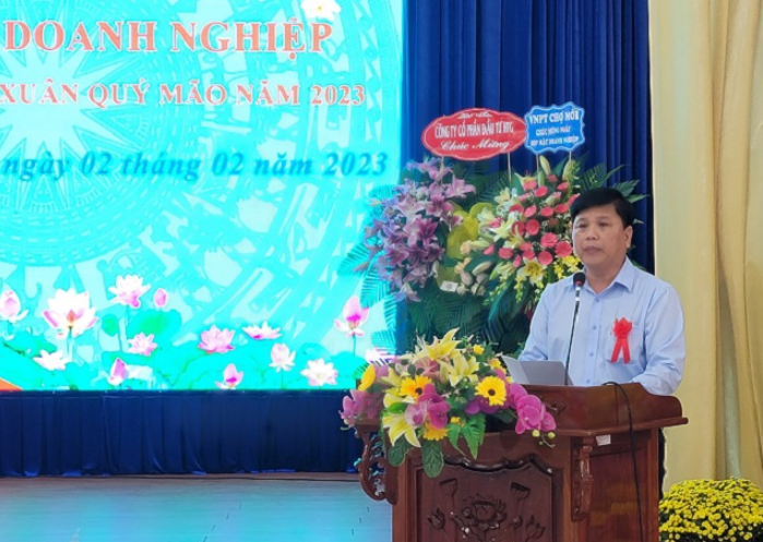 Ông Cù Minh Trọng - Chủ tịch UBND huyện Chợ Mới, tỉnh An Giang phát biểu tại buổi họp mặt đầu năm 2023 với các doanh nghiệp trên địa bàn.
