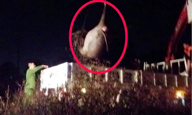 Quá trình đưa xác con trâu ra khỏi hiện trường. Ảnh: Báo Bắc Giang