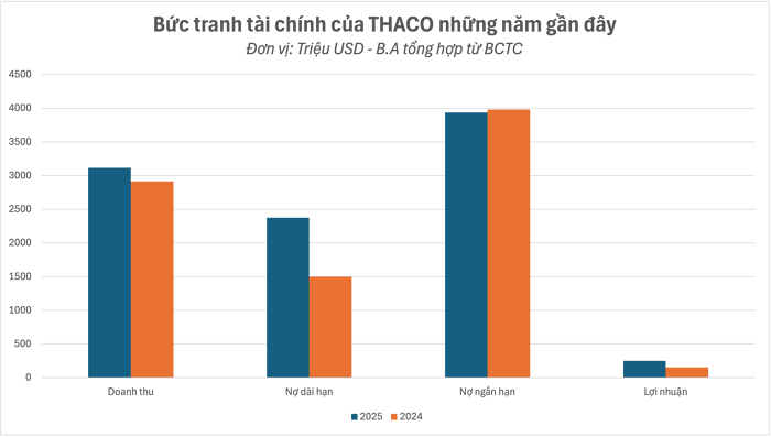 Nợ dài hạn năm 2025 là 2,376 tỷ USD, trong đó nợ tài chính chiếm phần lớn với 2,167 tỷ USD, tăng mạnh so với mức 1,497 tỷ USD của năm 2024. Tổng nợ ngắn hạn ở mức 3,938 tỷ USD, giảm nhẹ so với mức 3,982 tỷ USD của kỳ trước. Trong năm 2025, chi phí lãi vay tăng của THACO tăng nhẹ từ 233 triệu USD lên 260 triệu USD, thu nhập từ lãi vay của doanh nghiệp này lại có xu hướng ngược lại khi giảm từ 102 triệu USD xuống 96 triệu USD.