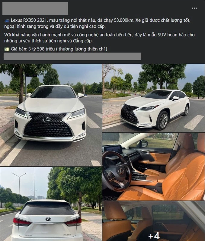 Theo tham khảo, một chiếc Lexus RX 350 sản xuất năm 2021 đang được rao bán trên sàn xe cũ với mức giá 3,598 tỷ đồng (có thể thương lượng thêm).
